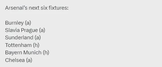 阿森納未來6場比賽:客戰(zhàn)伯恩利,客戰(zhàn)布拉格斯拉維亞、客戰(zhàn)桑德蘭、主戰(zhàn)熱刺、主戰(zhàn)拜仁、客戰(zhàn)切爾西。