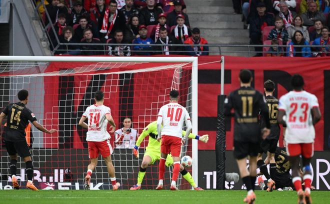 第41分鐘,羅慕洛近距離射門,打遠(yuǎn)角,皮球稍稍偏出左側(cè)立柱,差之毫厘。第45分鐘,萊比錫進(jìn)球了!沙博特在門前伸腳解圍,結(jié)果把球擋進(jìn)自家球門。這粒烏龍球讓斯圖加特陷入被動局面。半場結(jié)束,萊比錫1-0領(lǐng)先斯圖加特。萊比錫上半場控球率43%,10次射門,5次射正,進(jìn)了1球。而斯圖加特上半場9次射門,沒能進(jìn)球。